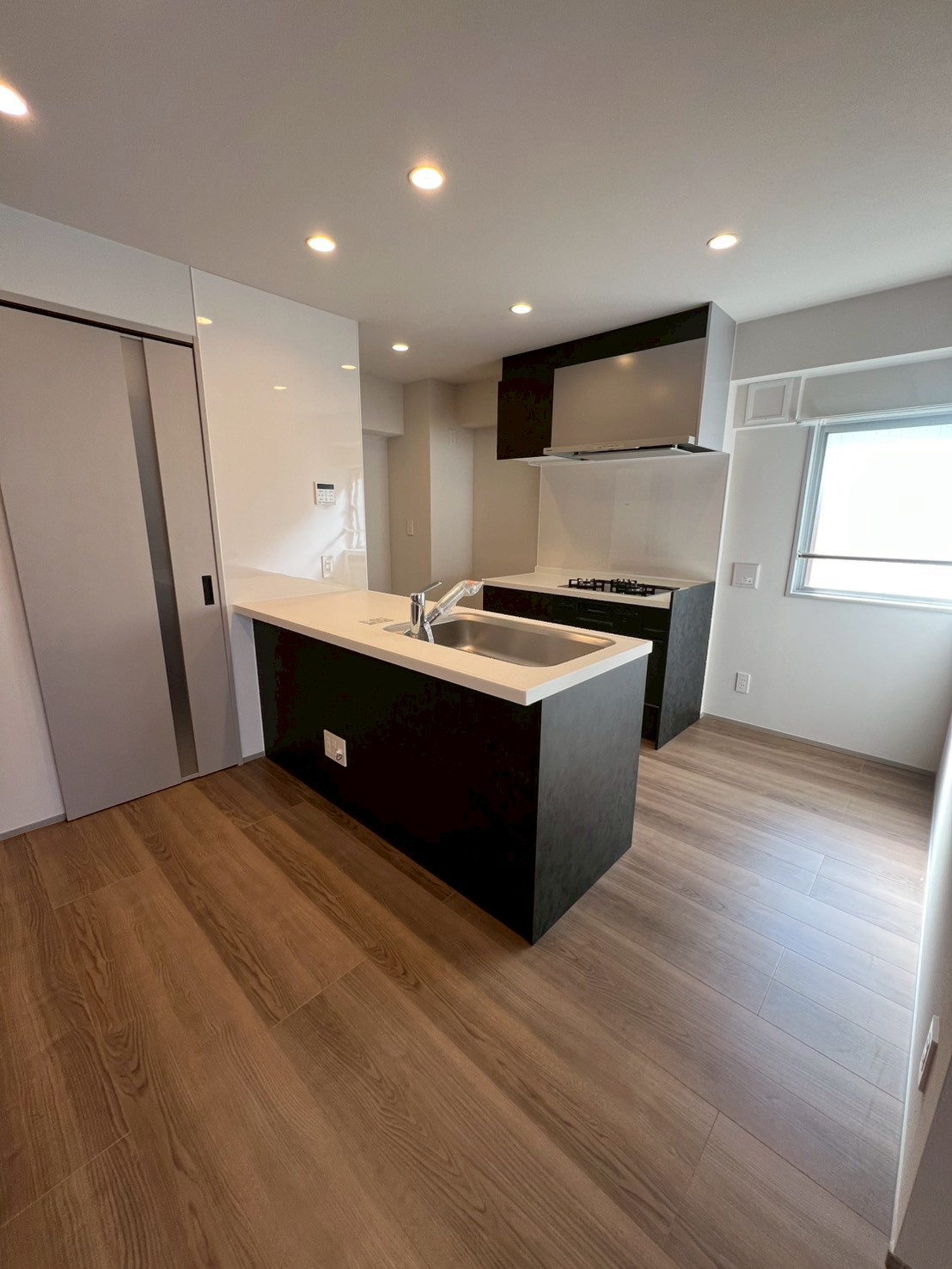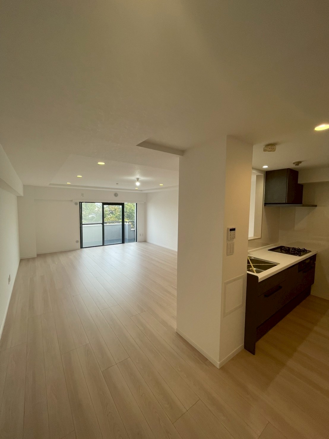 潤いのある緑地に向けて大きな窓をとったマンション。暮らしの中で景色を楽しめるように、キッチンを中心に間取りを再構築しました。 独特の表情をもつ木材とシンプルな白壁が響き合う端正な住まいです。